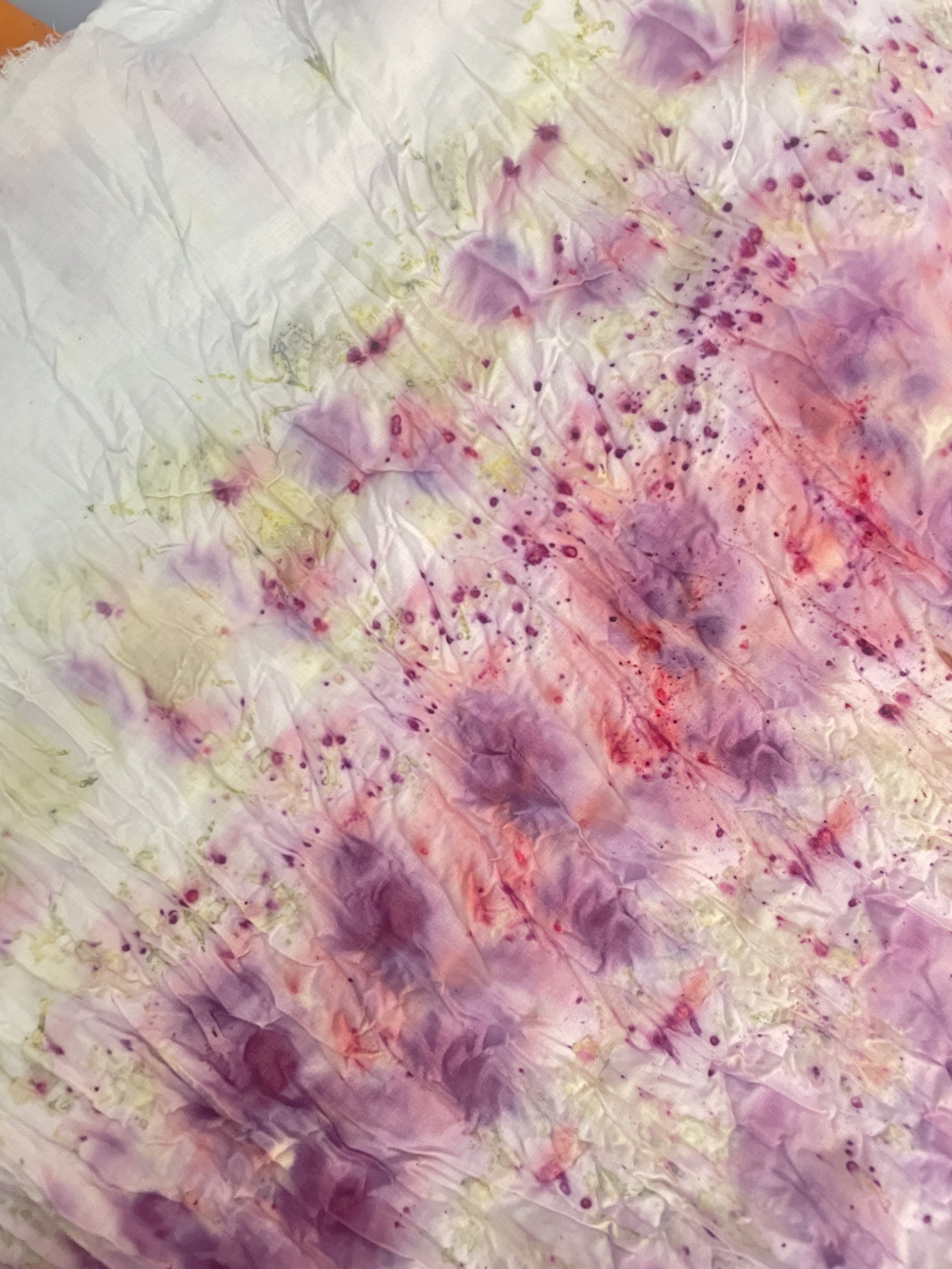 Cochineal dyed cotton and lace, self patterned and machine sewn